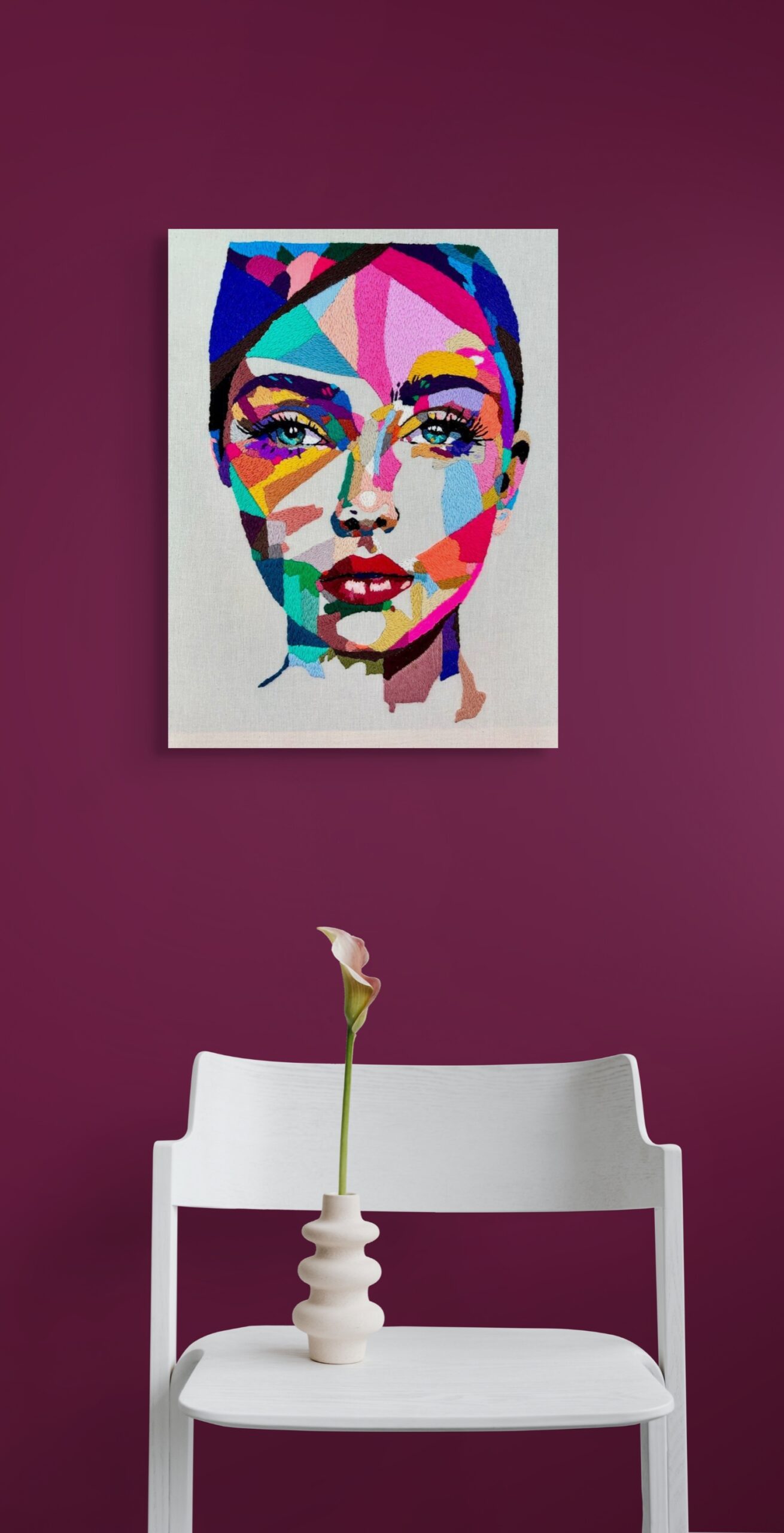 De kleuren versterken de emotie, speels maar krachtig, zonder af te leiden van de essentie. De borduursteken volgen de vormen van het gezicht, waardoor er diepte en beweging ontstaat. Dit werk trekt je blik en laat je niet meer los.